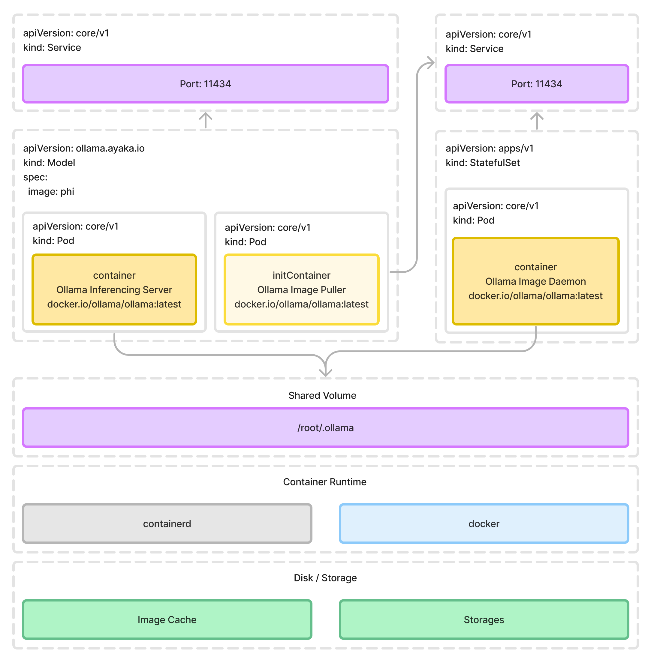 Although it's a standalone service, we are not deploying large registry server like Docker Registry or Harbor. What Ollama Operator will do, is simply start a server with the ollama serve built-in command. At the time where each model inference service got created, a image pull request will be sent directly to this service.